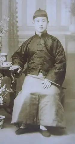 Around 1923, Liu Wanchuan moved to Beijing to make a living and took up advanced studies with Yin Fu's son Yin Yuzhang. He studied with him for eight years.[1] From the early 1930s onward Liu worked as an accountant for a restaurant called YuChun Lou (Jade Spring Restaurant) that was owned by Li Shao'an (1888-1980) (also known as Li MengRui). Li Shao'an was from the same village as Liu,[4] and had studied with Li Wenbiao, Yin Yuzhang, Liu Bin, and Liang Zhenpu, to whom he became a formal disciple.[5] Li Shao'an was known for his extraordinary skill in daishou (dragging palm) and was thus given the nickname, "Iron Arm Li."[4]
