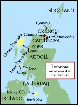 The saga relates how in Orkney, Sveinn murdered one of the earl's followers, and immediately fled to the Bishop of Orkney. The bishop protected Sveinn by sending him away to the Suðreyjar, into the care of Holdboði Hundason, a chieftain on the Inner Hebridean island of Tiree.[24] Later, in early spring,[note 4] the saga relates how Sveinn travelled to Atholl, where he stayed for a long period of time. From Atholl, Sveinn made his way back towards Orkney by land, and on the journey northwards, he passed through Thurso, in Caithness. The saga notes that Sveinn was accompanied by Ljótólfr, and that Sveinn had spent much of the previous spring with Ljótólfr.[25] The chieftain who lived at Thurso was an earl named Óttarr, who is described as "a man worthy of honour".[23] Earl Óttarr was a brother of Frakökk, and the saga relates how Ljótólfr negotiated a truce between Sveinn and Earl Óttarr, after Sveinn's father was killed by Ölvir.[25]