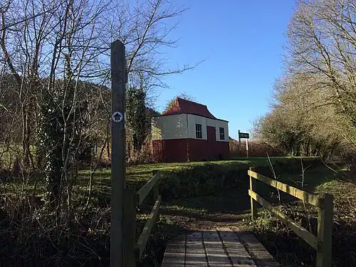 The branch was incorporated into the Great Western Railway at the Grouping of 1923, passing on to the Western Region of British Railways on nationalisation in 1948. Passenger services were discontinued in 1951, general freight in 1963 and milk traffic from near Felin Fach ceased in 1973.[2] The halt had a single platform and the line nearby was placed in cuttings to hide the line from the owners of the Llanerchaeron estate. The trackbed here is now a footpath, and the platform, nameboard and pagoda-roofed GWR shelter have been restored.[3]