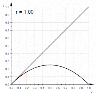 When r is changed, the vertex moves up or down, and the shape of the parabola changes. In addition, the parabola of the logistic map intersects with the horizontal axis (the line where ) at two points. The two intersection points are and , and the positions of these intersection points are constant and do not depend on the value of r.