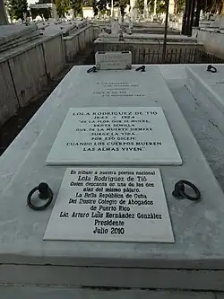 In 1919, Rodríguez de Tió returned to Puerto Rico where she was honored with a great banquet at the Ateneo Puertorriqueño after she recited her "Cantos a Puerto Rico". Lola Rodríguez de Tió died on November 10, 1924, and is buried at the Colón Cemetery in Havana, Cuba.[3]