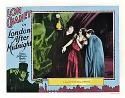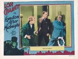 London After Midnight (original working title: The Hypnotist) is a lost 1927 American silent mystery horror film directed and co-produced by Tod Browning and starring Lon Chaney, with Marceline Day, Conrad Nagel, Henry B. Walthall, and Polly Moran. The film was distributed by Metro-Goldwyn-Mayer, and was written by Waldemar Young, based on the story "The Hypnotist" which was written by Browning. Merritt B. Gerstad was the cinematographer, and the sets were designed by Cedric Gibbons and Arnold Gillespie.[4] Harry Sharrock was the assistant director. The film cost $151,666.14 to produce , and grossed $1,004,000 (equivalent to $18,173,939 in 2024). Chaney's real-life make-up case can be seen in the last scene of the film sitting on a table, the only time it ever appeared in a film.