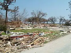 Hurricane Katrina struck the city on August 29, 2005, destroying almost all buildings within 500 m (1,600 ft) of the Gulf of Mexico shoreline. Many Long Beach residents were left homeless or living in water- and or wind-damaged houses. At least one person was confirmed dead.[11]