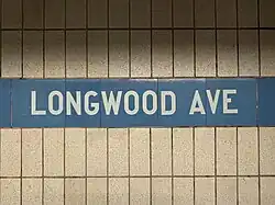 Both platforms were extended at either ends in the 1960s to accommodate the current standard length of an IRT train (514 feet (157 m)). The extensions are noticeable as they are narrower than the rest of the platforms, have no columns, and the trim line is blue with "LONGWOOD AVE" in white sans serif font. The extensions result in the platforms being slightly offset.