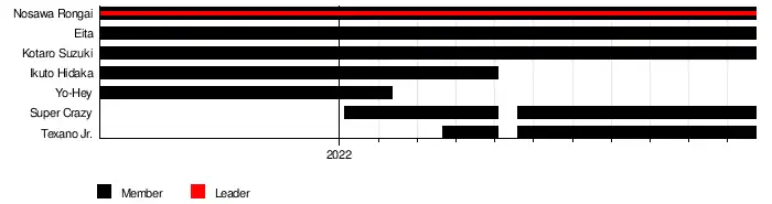 In December, Suzuki aligned himself with Rongai and his mystery partner, who later revealed to be Ikuto Hidaka. Over the following months, the trio continued their rivalry with Stinger, while also being joined by Yo-Hey in May 2021 following the disbandment of Full Throttle.[2] The following month, Dragon Gate wrestler Eita, who had previously worked in Mexican wrestling promotions and met Rongai in 2017, was revealed to be the newest member of the group.[3]