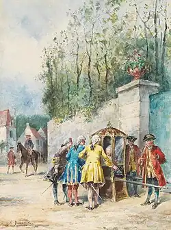 Benassit also began to be taken more seriously as a painter. In February 1880, he had a one-man exhibition and sale of 32 paintings and five watercolors at the Hôtel Drouot. The catalogue included an appreciation by Charles Monselet that indicates the exhibition consisted largely or entirely of Benassit's charming, gently comical period pieces: