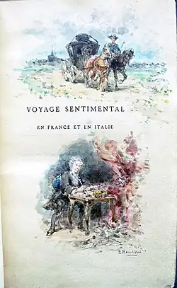 After the war, Benassit resumed his work as an illustrator. An 1875 edition of Laurence Sterne's Voyage Sentimental published by Librairie des Bibliophiles and acquired in 2011 by Princeton University is extra-illustrated with watercolors by Benassit especially commissioned for the volume.[21] He also illustrated Eugène Chavette's Les Petites comédies du vice and Anatole France's first novel, Le Crime de Sylvestre Bonnard.[22]