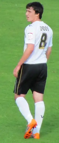 On 9 August 2008, Dodds made his first start for the Vale in the opening game of the season against Luton Town and he was quick to win over his new supporters, scoring Vale's opening goal of the season with a 20 yards (18 m) right-footed shot.[14] He further enhanced his popularity with the Vale faithful with a long range strike against Shrewsbury Town.[15] He especially enjoyed great popularity with the club's female support, as he took away the club's 2009 "Mr Shirt of the Back" Award;[16] he went on to pick up the award for three seasons running.[17][18] He scored a total of ten goals in 48 games in 2008–09.