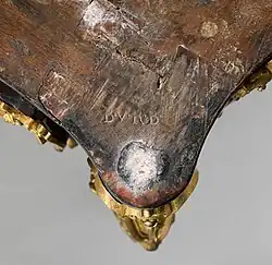 After 1751 each work was signed by the master craftsman who oversaw the work. This mark, called the Estampille, used a heated iron to mark the piece with the initials of the master. It was usually placed on the back of the rear traverse of chairs, under the marble of commodes and secretaries, and under the surrounding ceinture of tables. marks are often missing, either forgotten by the craftsman, or defaced. Given the high value of signed pieces by famous craftsmen, Counterfeit Estampilles are not unknown.[9]