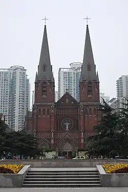Around this time, Zhang served first as the rector of Saint Peter's Church, Shanghai, and then as the acting rector of Xujiahui Seminary.[3] In April 1960, the Shanghai CPA elected Zhang as the bishop of the Diocese of Shanghai.[17] On the 26th of the month, Zhang was consecrated bishop under the self-election, self-consecration principle by Archbishop Ignatius Pi Shushi and Bishop Francis Xavier Zhao Zhensheng, along with Matthias Wu Guohuan, Shu Qishei (舒其谁), and Fang Zhigang (方志刚).[18] The ceremony happened at St. Ignatius Church, Xujiahui, which became the cathedral of the Diocese of Shanghai since then.[19] According to Mariani, Rome denounced Zhang's consecration.[20] Zhang was also elected as the vice chair of the Shanghai CPA, subordinate to the chairman Hu Wenyao.[21] In summer 1960, Zhang told an Italian journalist that he and Rome were not in touch with each other.[20] According to Zhang's successor Aloysius Jin Luxian, during this period of Zhang's episcopate, he could only write dossiers to explain his own background or expose other people politically.[22]