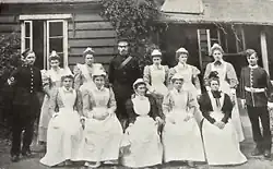 As well as the Matron or Lady Superintendent there were fourteen nurses in 1908. All were qualified but seven of them were short-term appointees doing additional training in midwifery. The hospital was already an officially recognised midwifery training school preparing twenty nurses a year for the Central Midwives Board examination.[6] By 1912 there were two weekly clinics: one for tooth extraction and one for "special gynaecological outpatients".[7]