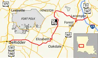 Louisiana Highway 112 (LA 112) is a state highway in Louisiana. It spans 80.9 miles (130.2 km) and runs from west to east. LA 112 is a mostly rural two lane highway with a maximum speed limit of 55 miles per hour (89 km/h) per hour. The western terminus is at an intersection with U.S. Route 171/U.S. Route 190 in Beauregard Parish and the eastern terminus at an intersection with US 167/US 71 in Rapides Parish. Although the highway runs west to east it meanders through three parishes and on the map appears to make a large S.