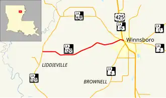 Louisiana Highway 130 (LA 130) is a state highway located in Franklin Parish, Louisiana. It runs 7.32 miles (11.78 km) in an east–west direction from LA 135 north of Liddieville to a junction with U.S. Highway 425 (US 425), LA 4, LA 15, and LA 17 in Winnsboro.