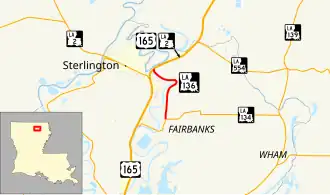 Louisiana Highway 136 (LA 136) is a state highway located in Ouachita Parish, Louisiana that runs 3.50 miles (5.63 km) in a north–south direction from LA 134 at Fairbanks to a junction with U.S. Highway 165 (US 165) and LA 2 at the eastern limit of Sterlington.
