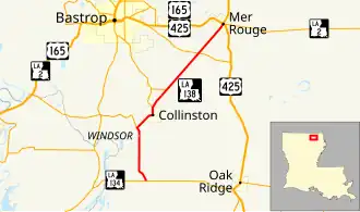 From the south, LA 138 begins at an intersection with LA 134 (Coulee Swamp Road) in southern Morehouse Parish. LA 134 connects to the city of Monroe on the southwest and the village of Oak Ridge on the east. LA 138 proceeds northward along Doss Highway through rural farmland and crosses the Union Pacific Railroad tracks at a point known as Windsor. 1.7 miles (2.7 km) later, LA 138 intersects LA 554 (Perryville Road), which heads west to US 165 between Monroe and Bastrop. Here, the highway curves to the northeast and heads into Collinston.[2][3][4]