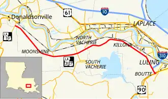 Louisiana Highway 3127 (LA 3127) is a state highway in Louisiana that serves Ascension, St. James, St. John the Baptist, and St. Charles Parishes. It spans 42.1 miles (67.8 km) in a northwest to southeast direction.[1] It parallels LA 18 along the west bank of the Mississippi River, providing a much shorter inland bypass of the River Road. It is bannered in all four cardinal directions depending upon the part of the route.
