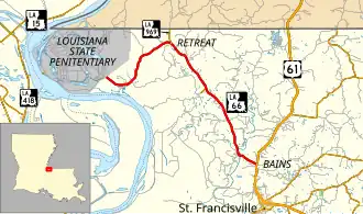 From the west, LA 66 begins at the main entrance to the Louisiana State Penitentiary at Angola, formerly the site of a 19th century plantation now within the boundaries of the prison. The maximum security facility is located within a bend of Mississippi River in the northwestern corner of West Feliciana Parish near the Mississippi state line. LA 66 heads southeast through a thickly wooded rural area and passes through the tiny community of Tunica. The highway then curves to the northeast, passing between the north and south tracts of the Tunica Hills Wildlife Management Area.[2][3][4]