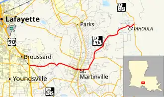 The route passes through St. Martinville, the seat of St. Martin Parish, located on Bayou Teche. It connects the city with U.S. Highway 90 (US 90), the main highway through the Teche region, just southeast of Lafayette. East of St. Martinville, LA 96 travels to the small community of Catahoula, which is located on Catahoula Lake at the edge of the Atchafalaya Basin.
