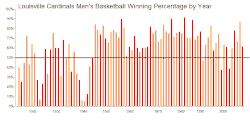 As of the end of the 2015–16 season, Louisville had an all-time 1778–892 record in 102 seasons of intercollegiate basketball ranking 10th in all-time victories and seventh in all-time winning percentage among NCAA Division I schools. From 1944 to 1990, Louisville had an NCAA-record 46 straight winning seasons, winning 20 or more games on 31 occasions during that period.
