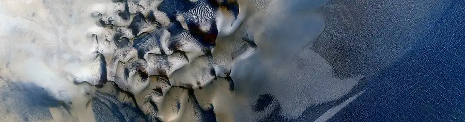 The ice mound is divided into four feature types: smooth interior ice, irregular "trough-bearing" ice, sand dunes, and "stucco" rough ice.[4] One feature of the central mound are elongate features interpreted to be sastrugi, that being windswept ice mound and groove features. Unlike sand dunes, whose ridges are perpendicular to the direction of the wind, the ridges of sastrugi are parallel.[4][11] The variation in albedo featured by the aforementioned sastrugi that was observed by Brown et al. was not understood at this point.[4] Another feature of the central mound is that of a cluster of dark sand dunes at the edge of the deposit, water ice was found to have deposited likely after the formation of the dunes. The formation of the dune system is not fully understood, and multiple theories exist for their formation. This includes their formation prior to the ice mound's creation,[5] their formation after the ice mound and the ice found on the dunes is simply frost, or the dunes are a product of material left behind after another material sublimated.[4] It was later found that ice mound exchanges water ice from the surrounding regolith.[11] Ice that was described as resembling stucco was thought to be the youngest portion of the water ice mound. Arcuate features within the stucco ice is thought to represent the growth of the ice mound, similar to other features known as north polar layered deposits (NPLD) found in other Martian craters.[4] The northern border of the ice mound is abrupt in its transition to the regolith, the southern border in comparison, is diffuse.[8] Anomalous "defrosting spots" that persist into the summer are present in Louth, akin to features in other Martian polar regions, the features, which resemble dark smudges, are not fully explained.[16]
