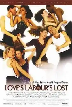 Love's Labour's Lost is a 2000 British musical romantic comedy film written, directed by, and starring Kenneth Branagh. It is an adaptation of William Shakespeare's early comic play of the same name and marks the first feature-length film version of this lesser-known work. The ensemble cast features a mix of Shakespearean veterans, including Timothy Spall, Richard Briers, and Geraldine McEwan, as well as Hollywood actors Alicia Silverstone and Matthew Lillard, and stage performers such as Nathan Lane and Jimmy Yuill.[1][2]