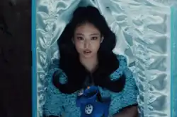 An accompanying music video for "Love Hangover" was released alongside the single on January 31. Directed by duo Bradley & Pablo and shot in Mexico City, the video stars American actor Charles Melton as Jennie's boyfriend and sees the two going on a series of dates that all end in disaster.[17] In the opening scene, Jennie gets laid to rest at her funeral in a baby blue casket as her boyfriend grieves. Several flashbacks to their dates show that they each end with Jennie's untimely death, depicting her being eaten by a kaiju that pops out of a movie screen, choking on a martini olive at a restaurant, throwing herself into a bowling accident, and falling from a great height.[18] On Lee Hye-ri's YouTube show Hyell's Club, Jennie explained that the concept of the music video was inspired as a dramatic reflection of the song's lyrics, in which she continues to fall in love despite getting hurt and "dying" each time.[16]