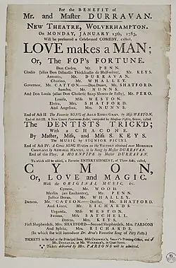 - ^ Colley Cibber (1701). Love Makes a Man: Or, The Fop's Fortune. A Comedy. Acted at the Theatre Royal in Drury Lane, by His Majesty's Servants. Written by C. Cibber. London: Printed for Richard Parker at the Unicorn in the Piazzas under the Royal Exchange, Hugh Newman at the Grasshopper in the Poultry, and E. Rumbal at the Post-house in Russel-street, Covent Garden. OCLC 1325917466.