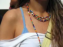 Love beads are one of the traditional accessories of hippies. They consist of one or more long strings of beads, frequently handmade, worn around the neck by both sexes. The love bead trend probably evolved from the hippie fascination with non-Western cultures, such as those of Africa, India, and Native America, which make common use of similar beads.[1]