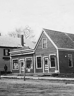 The post office until around 1905. The first postmaster was Payne Elwell (1744–1820) in 1793. (He lived in the building that is now 162 Main Street, which stands on the former site of the Knights of Pythias Hall, Westcustogo Lodge, No. 33)[19] He was succeeded in 1803 by Samuel P. Russell, David Drinkwater in 1804, John Hale in 1810, Daniel Mitchell in 1816, James C. Hill in 1834, Jacob G. Loring in 1842 and Reuben Cutter in 1845.[2] When the town split occurred, the office name was changed in 1852 to Yarmouth from North Yarmouth. Reuben Cutter resumed the role, and was followed by Otis Briggs Pratt in 1861 and Nicholas Drinkwater in 1866. Lucy V. Groves was appointed in 1868, becoming the first woman named or elected to an official position in the town of Yarmouth. Lucy Q. Cutter succeeded her in 1887, Melville C. Merrill in 1898, Frank Howard Drinkwater in 1911, Frank O. Wellcome in 1914 and Ernest C. Libby in 1936.[20]