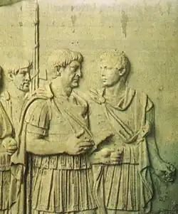 Licinius Sura was a close and trusted companion of the emperor Trajan, and Cassius Dio tells how Trajan proved his fidelity: one day, without prior notice, he went to Sura's house; then, after dismissing his bodyguard, Trajan bathed, had Sura shave him, and dined with him. The following day he said to those who had disparaged Sura: "If Sura had desired to kill me, he would have killed me yesterday."[8] How Sura came to be a trusted companion is unclear. Edmund Groag surmised that it was Sura who suggested Trajan's name as an heir to the emperor Nerva after the latter was confronted by a mutiny by the Praetorian Guard.[9] However, this view has been challenged: when discussing the details of Nerva's choice of Trajan as an heir in October 97, John D. Grainger simply omits all mention of Groag's theory.[10] Werner Eck now supports Groag's point of view.[11]