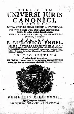 He was proclaimed doctor of civil and canon law in 1657, ordained priest the following year, and was soon professor of canon law at the university.[4] He published scholarly works under the name Ludwig Engel or, using its Latin form, Ludovicus Engel.