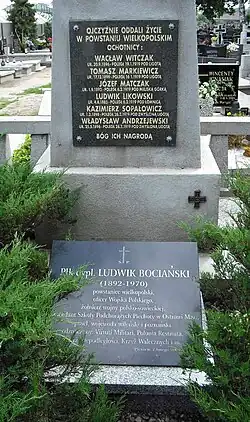 He died on February 7, 1970, in London and is buried in Gunnersbury Cemetery.[19] In 2009, on the initiative of Michał Karalus, the starost of Pleszew, the ashes of Col. Ludwik Bociański - in accordance with his last will - were brought to his hometown of Pleszew and laid with military honors in the quarters of the Greater Poland insurgents at the cemetery at Kaliska street.[20]