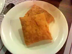 Luqmi (Urdu: لقمی; pronounced lukhmi in Dakkhani) is a typical mince savoury or starter of the cuisine of Hyderabad, Telangana, India.[1] The snack's authentic preparation includes stuffing with mutton-mince qeema (ground meat). The luqmi is a flat square pastry.[2]