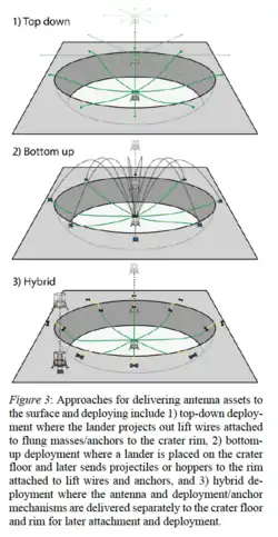 - ^ Wang, Rebecca; Gehlot, Vinod P.; Bandyopadhyay, Saptarshi; McGarey, Patrick M.; Byron, Benjamin; Pisanti, Dario; Wilson, Ron; Jenks, Kenneth (23 January 2023). "Lift Wire Deployment and Anchoring System for the Lunar Crater Radio Telescope on the Far Side of the Moon". AIAA SCITECH 2023 Forum. American Institute of Aeronautics and Astronautics. doi:10.2514/6.2023-1787. ISBN 978-1-62410-699-6. S2CID 256134317.