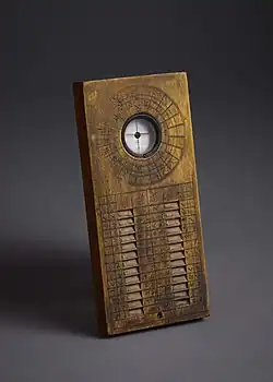 The oldest precursors of the luopan are the 式; shì or 式盤; shìpán, meaning astrolabe or diviner's board—also sometimes called liuren astrolabes[5]—unearthed from tombs that date between 278 BCE and 209 BCE. These astrolabes consist of a lacquered, two-sided board with astronomical sightlines. Along with divination for Da Liu Ren, the boards were commonly used to chart the motion of Taiyi through the nine palaces.[6][7] The markings are virtually unchanged from the shi to the first magnetic compasses.[5] The schematic of earth plate, heaven plate, and grid lines is part of the "two cords and four hooks" (二繩四鉤; èrshéngsìgōu) geometrical diagram in use since at least the Warring States period.[5] The zhinan zhen or south-pointing needle, is the original magnetic compass, and was developed for feng shui.[8] It featured the two cords and four hooks diagram, direction markers, and a magnetized spoon in the center.