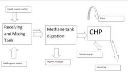 The Lusaker Biogas Plant generates heat and electricity from biogas produced from poultry manure of the Lusakert Pedigree Poultry Plant. For production of biogas, the liquid manure is processed in an anaerobic digesters of 2,200 cubic metres (78,000 cu ft) at temperature of 38 °C (100 °F).[3] There is an option to build the second digester. The LBP was considered to produce 5,280 cubic metres per day (186,000 cu ft/d) of biogas with a methane (CH4) content of 70%. Remains of manure are used for production of 75,000 tonnes of organic fertilizer per year. After removing sulfuric acid from gas, it is used for heat and power generation.[4] The LBP has installed electric capacity of 0.85 MW and it is able to generate 7 GWh of electricity annually.[1] The average capacity that Lusakert Biogas Plant runs with is 50-60%. The electricity produced at LBP is sold at 40 drams (about 7.5 cents) per kilowatt. In 2014, the plant did not generate electricity due to economic difficulties of the poultry plant which resulted in low amounts of wastes.[1]