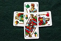 Lusti-Kartl'n or Lusti-Kartn is a Bavarian trick-taking, card game for four players with an unusual rule for winning the tricks. Like the Czech game of Sedma, the winner of a trick is the last one to play a card of the same rank as the led card. Players form two teams of two and thus are able to smear their partner's tricks or play blanks if they think their opponents will win the trick. The only counters are the Aces and Tens, worth 10 points each, and there are 10 more points for the last trick. The aim is thus to win 50 or more points.