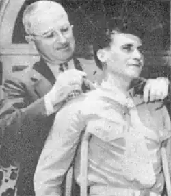 The Medal of Honor was presented to him by President Harry S. Truman at a White House ceremony on June 15, 1945, which included presentations to fellow Marine recipients Everett P. Pope and Carlton R. Rouh, as well as Army recipient Gino J. Merli, for their heroism during actions in the Central Pacific and European theatres.