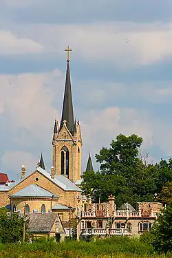 In the 18th century, the Carmelite Catholic church of the Virgin Mary was built on the site. In 1741, Anatol Bazalski donated 19,000 zloty for the church and for the Carmelite community from the village of Borokhiv. The church was built in the Baroque style. The walls and ceiling were adorned with frescos. Damaged by fire, the church was rebuilt in 1764. After being totally gutted by fire in 1845, the building lay in ruins for a period until the debris was removed, leaving small fragments of the walls and the foundations.