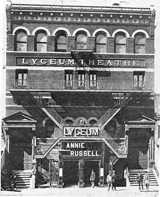 Actor, playwright and theatre technology innovator Steele Mackaye and producer Gustave Frohman built the theatre as the base for the Lyceum School of Acting, to be run by them and Franklin H. Sargent. The school quickly became the New York School of Acting and then, by 1888, the American Academy of Dramatic Arts (AADA).[3][4] Sargent soon left and after six months Mackaye and Frohman were forced to sell their interests to benefit Tiffany and other creditors.[5] Actress Helen Dauvray then became manager, making her one of the first woman theatrical executives in the U.S. Gustave's brother, the impresario Daniel Frohman, took over at the beginning of the theatre's third season and stayed until it was demolished in 1902, when he established the Lyceum Theatre on 45th St.[6]
