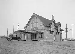 The Puget Mill Company leased out its demonstration farm in 1933 and ceased operations at Alderwood Manor later in the decade, amid declining sales during the Great Depression. At the same time, the opening of the Pacific Highway (modern-day Highway 99) in 1927 and the decline of Interurban service in the 1930s shifted the center of economic growth west near Scriber Lake. Seattle realtor Karl O'Brien filed a plat along Highway 99 at 196th Street Southwest in 1937, naming the development "Lynnwood" after his wife Lynn.[14] Nearby businesses adopted the name during the 1940s, leading to the formal use of "Lynnwood" by the chamber of commerce in 1946, instead of the suggested "West Alderwood".[6][15]