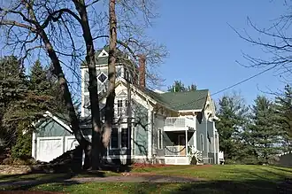 Lynnwood is a historic house at 5 Linden Avenue in Wakefield, Massachusetts. Built c. 1858, it is one of the town's finest examples of Stick style architecture. It is a 1+1⁄2-story wood-frame structure with an L-shaped cross-gable configuration; its features include deep eaves supported by arched brackets, and a 3+1⁄2-story tower topped by a hip roof with triangular dormer windows. Its eaves have brackets with pendants, and its windows have surrounds with drip molding.[2]