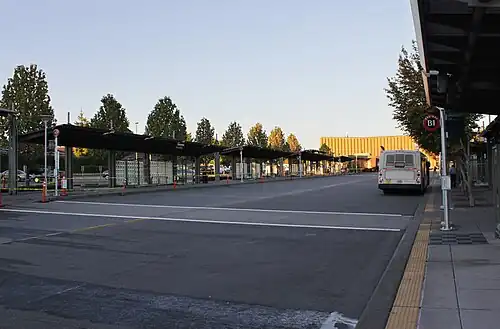 The Lynnwood Transit Center is located on the north side of Interstate 5 at 44th Avenue West, southwest of Alderwood Mall in Lynnwood. The 17.5-acre (7.1 ha) transit center includes 20 bus bays and a park and ride.[2] A five-story parking garage on the southeast side of the site provides 1,670 park and ride spaces and has driveways from two streets.[3] The bus bays have passenger information displays that have real-time arrival information for inbound buses. A customer service center called "RideStore" is located at the north end of the transit center.[4][5]