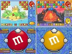 The player character is one of five different-colored M&M's (Red, Yellow, Blue, Green, or Orange), which vary in speed and power.[8][9] The controls are the same regardless of which color is chosen: the M&M constantly moves vertically and bounces off objects, eliminating any crystals that match its color and freeing the M&M's trapped inside.[6][8][10] The color of the player's M&M can be changed by bumping into color pots or blocks, which can be hidden,[8] especially in later levels. In both the Game Boy Advance and Nintendo DS versions of the game, the player uses the console's D-pad to move left and right, with the latter allowing the player to also use the touch screen to control their M&M's horizontal movement.[6] The sensitivity of the touch screen can be adjusted in the menu.[8] Pressing the A button or R button speeds up the M&M's movements, while pressing the B button or L button slows them down.[11]