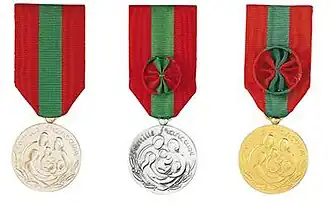 The Médaille de l'enfance et des familles (English: Medal of childhood and families), formerly known as the Médaille de la Famille française (English: Medal of the French Family) is a decoration awarded by the government of France to honour those who have successfully raised several children with dignity.[1] The decoration was created by a decree of May 26, 1920, under the name Médaille d'honneur de la famille française (English: Medal of honour of the French family), with the aim of honouring mothers of large families.[2] Although the medal rewards those with large families, the children must be "raised well" and the eldest must be at least 16 years old.