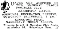 - ^ "Papakura Club Games". Franklin Times, Volume XXI, Issue 58. 18 May 1931. p. 8. Retrieved 29 March 2023.