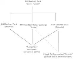 The chassis and running gear of the M3 design was adapted by the Canadians for their Ram tank. The hull of the M3 was also used for self-propelled artillery as with the original design of the M7 Priest, of which nearly 3,500 were built, and recovery vehicles.