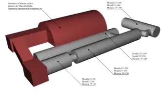 The isolation facility consisted of five different modules. Three – the habitat, utility, and medical modules – simulated the main spacecraft. The fourth module simulated the Martian lander and was connected to the main spacecraft. The fifth module was a simulator of the Martian surface, and is connected to the Martian lander. The combined volume of the modules was 550 m3 (19,000 cu ft).