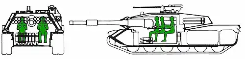 46 152 mm rounds could be carried on the models with Rheinmetall autoloaders. The MBT-70 with the GM autoloader could carry 48 rounds,[14] and the XM803 could carry 50 rounds.[15] The MBT-70 with the Rheinmetall loader carried 26 rounds in the autoloader. Twenty more rounds were carried in two compartments including eight rounds stowed on the rear hull bulkhead and twelve behind the driver's capsule.[16]