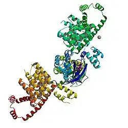 The active region of the C terminus consists of formin homology 1 and 2 (FH1 and FH2) and the Dia autoregulatory domain (DAD). The FH1 domain is predicted to be rope-like and it contains binding sites for profilin-actin complexes. The adjacent FH2 domain forms together with the FH2 domain of a second mDia1 molecule a head-to-tail doughnut shaped dimer that encircles the barbed end of an actin filament. Thus the FH2 domain has the ability to dimerize.[2]